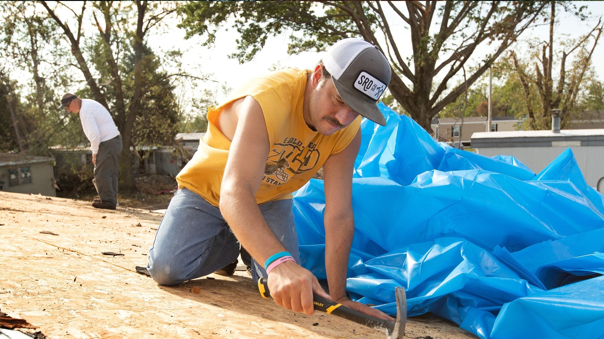 Jesse Parcher flattens roofing nails so they won’t tear a plastic tarp while he makes emergency repairs to a storm-damaged home in Marion, Iowa. Parcher was part of a volunteer team working with Marion First United Methodist Church.
