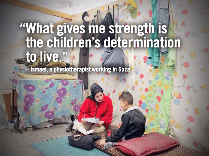 One of the most moving moments for me,” said Ismael, a physiotherapist, “was when, after months of sessions, a child with an amputated leg was playing with his peers again and laughing from the bottom of his heart. What gives me strength is the children’s determination to live, and their clinging to hope despite everything.”