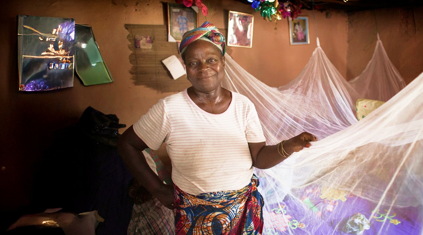 Matilda Ndanema displays the insecticide-treated mosquito net she received from The United Methodist Church’s Imagine No Malaria campaign in 2010 at her home in Bumpe, near Bo, Sierra Leone.